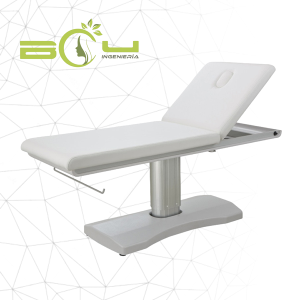 Camilla multifuncional de 2 cuerpos y elegante diseño. Equipada con 1 motor que permite regular la altura desde la botonera integrada en la estructura. La inclinación del respaldo es regulable mediante pistón de gas. Tapizado blanco en PU de gran calidad y fácil de limpiar. Portarrollos incorporado.