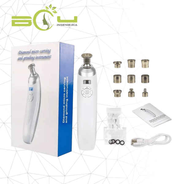 Microdermoabrasión portátil con 9 puntas de diamante de diferente apertura para diferentes zonas del rostro, el equipo viene inalámbrico
