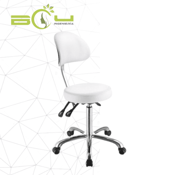 Silla elegante, asiento plano y circular con altura regulable mediante pistón de gas. Tapizado en PU de gran calidad y base cromada con ruedas